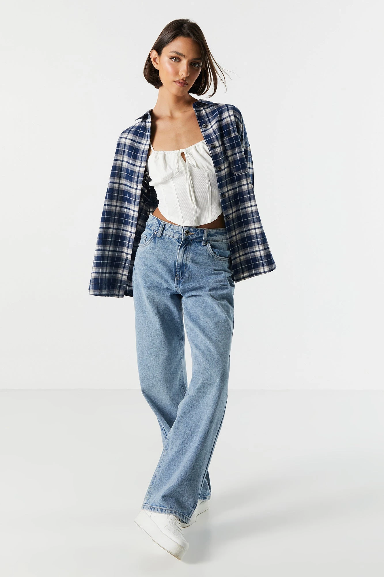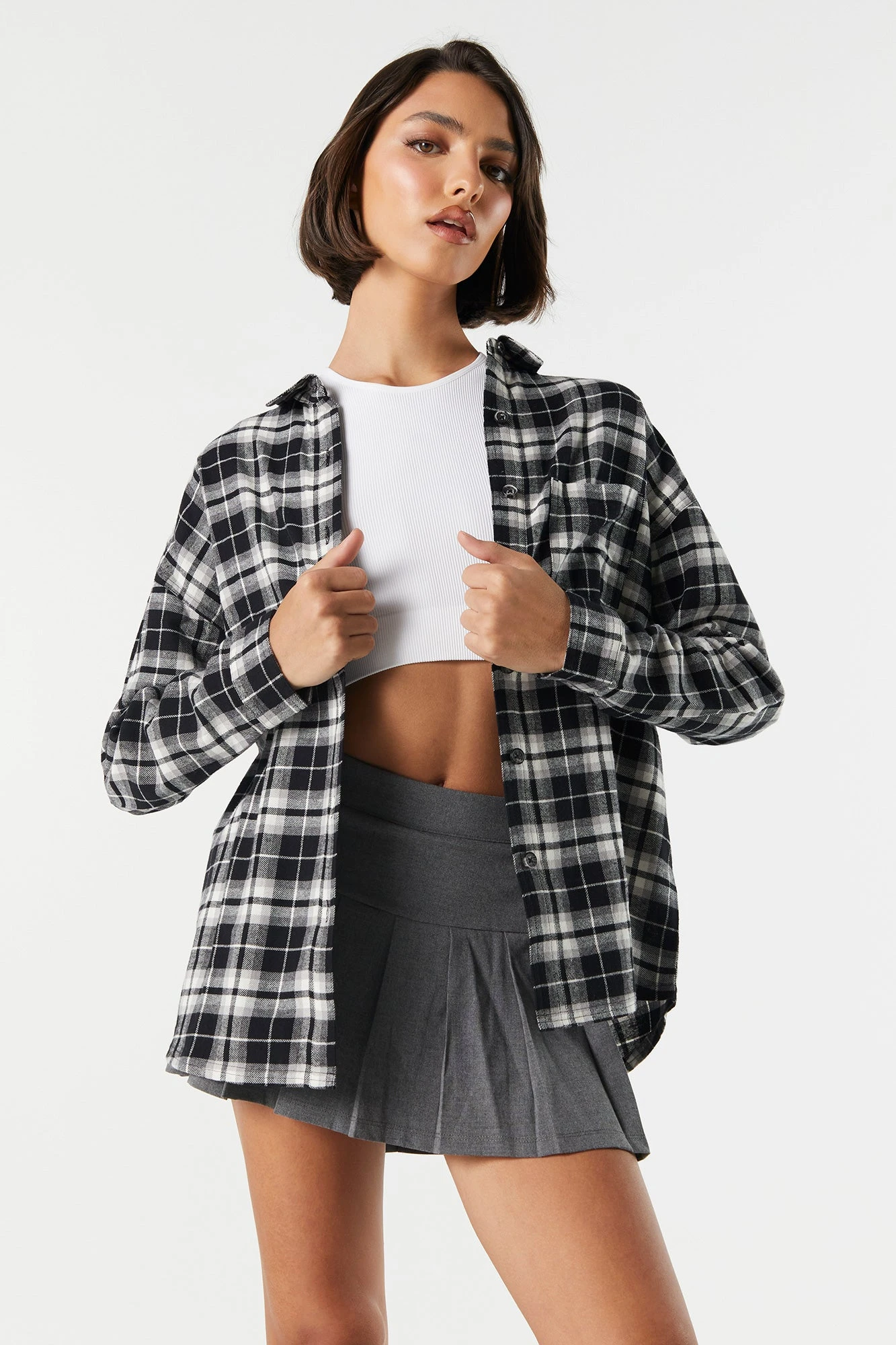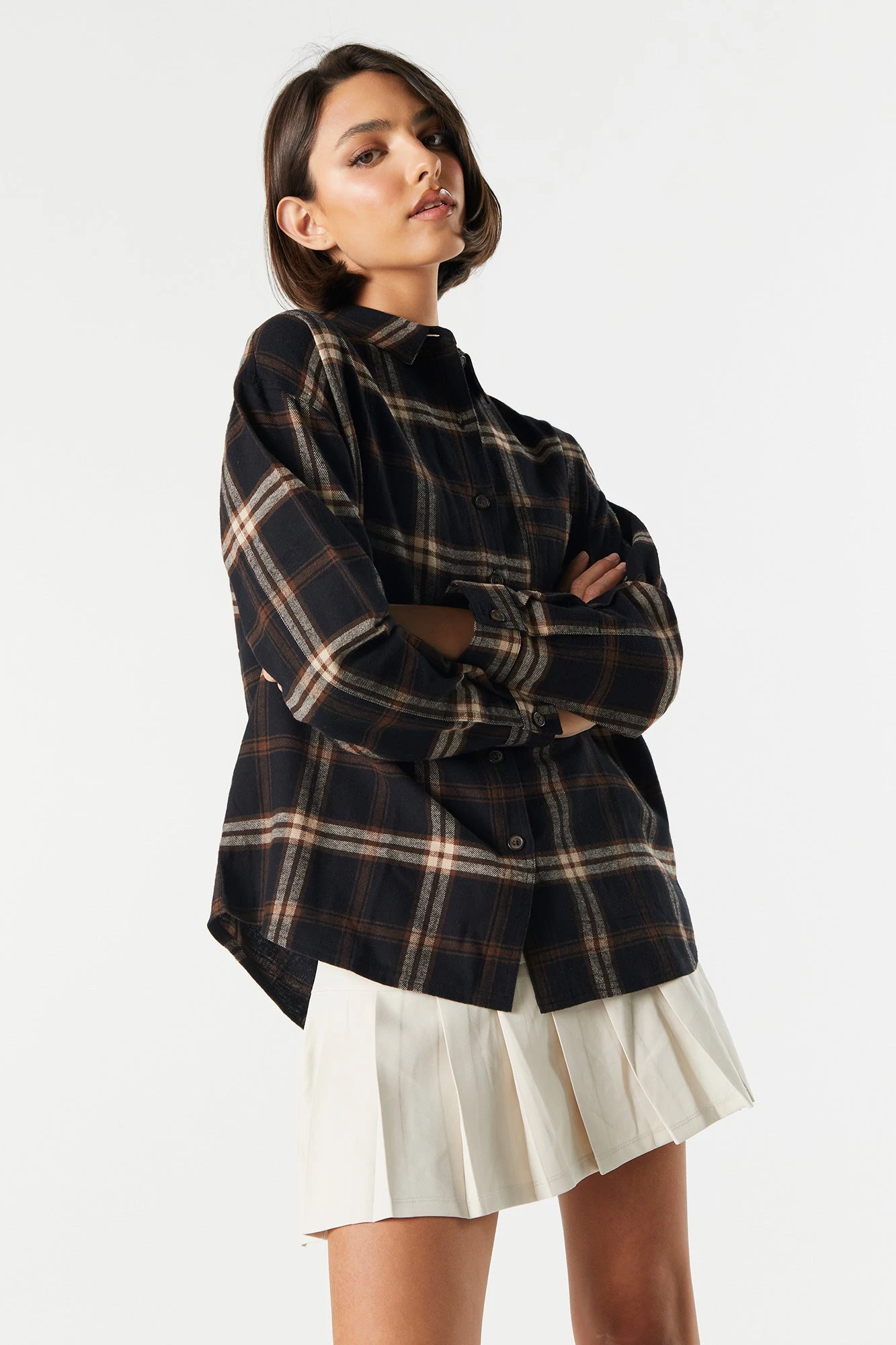 Who doesn’t love a good layer? This top features plaid print, collared neckline, button-up front, and long sleeves.