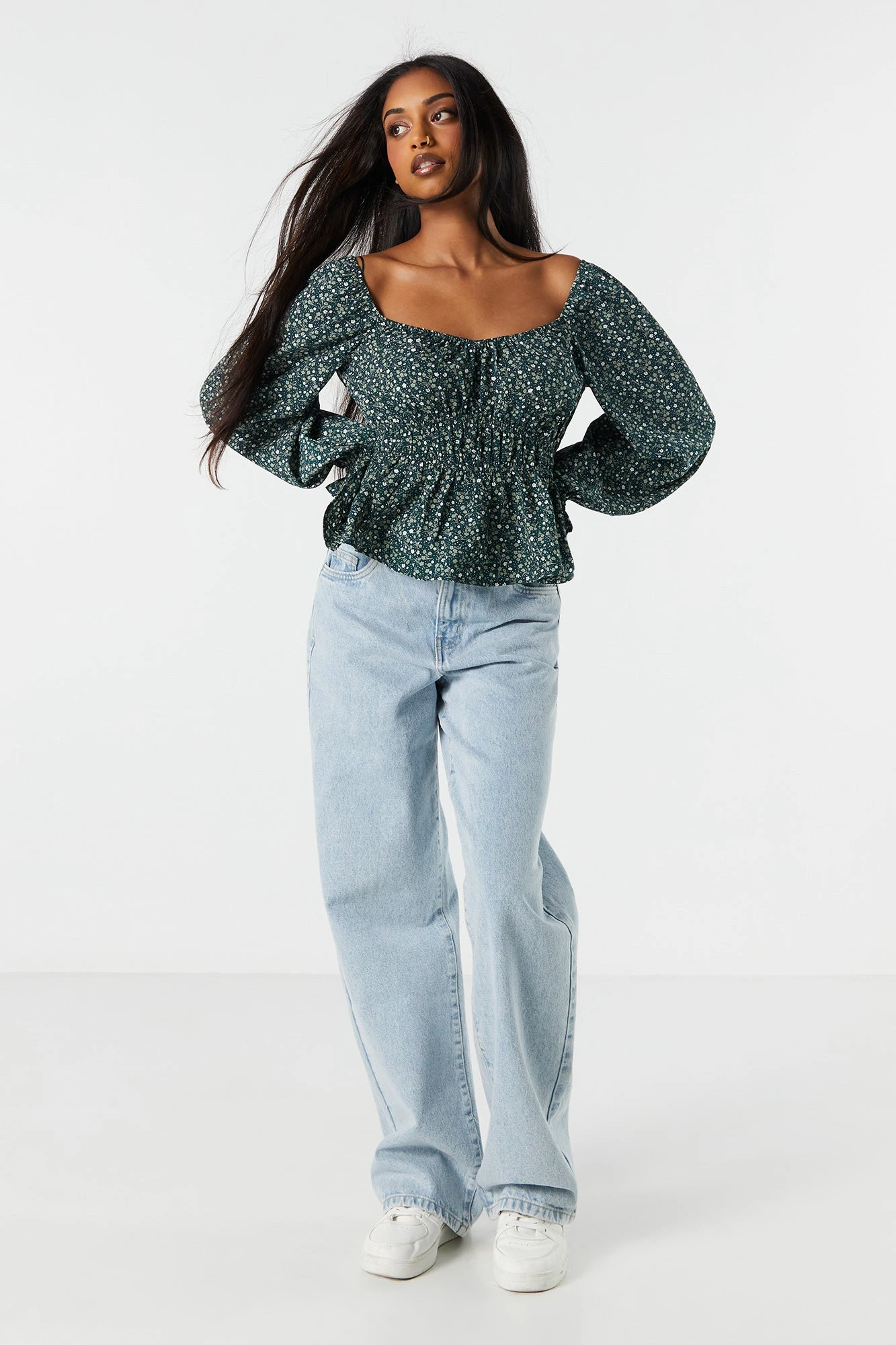 Own the spotlight in this versatile long sleeve. This top features floral print, elastic waist, long sleeves, V-neckline, and cinched wrists.