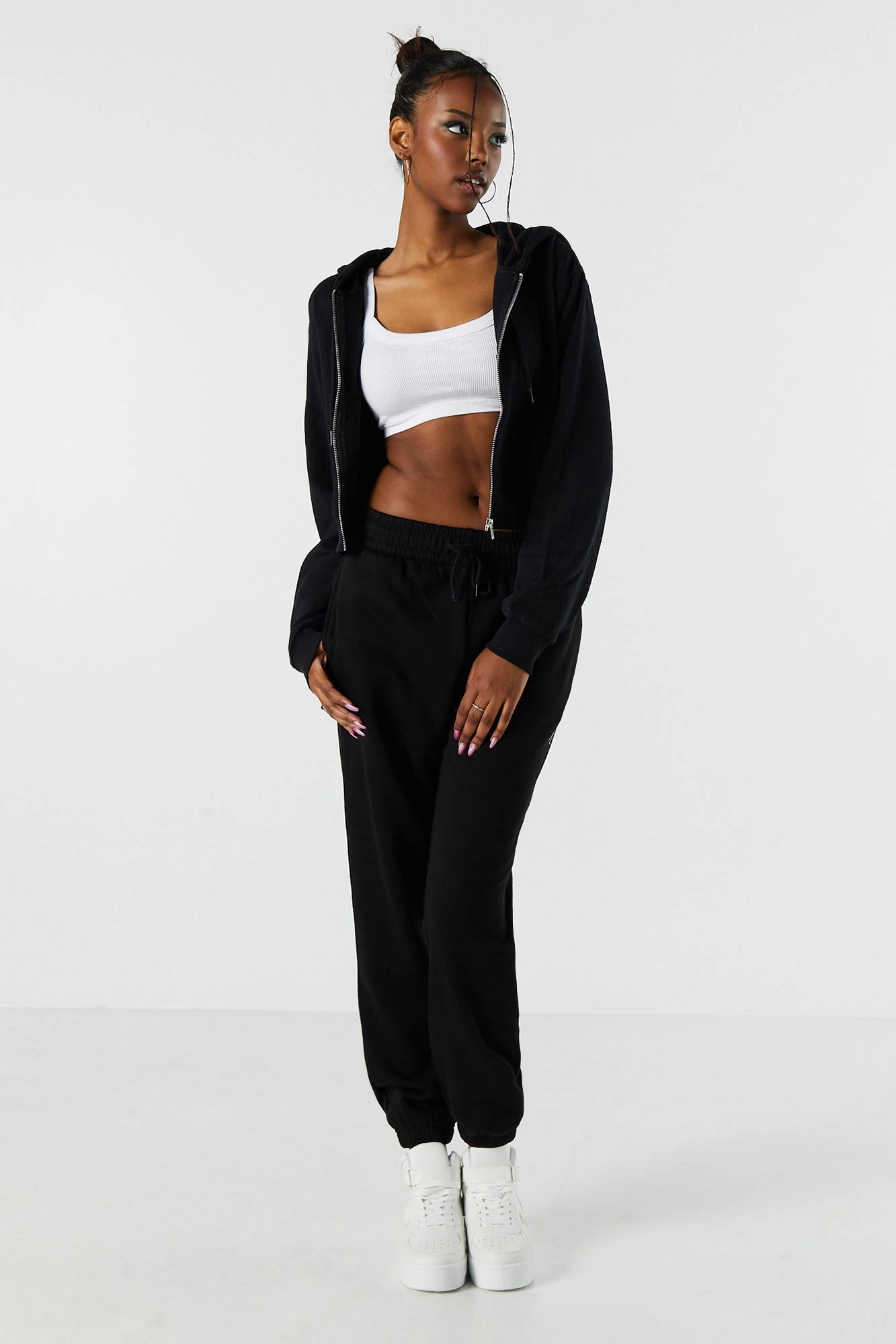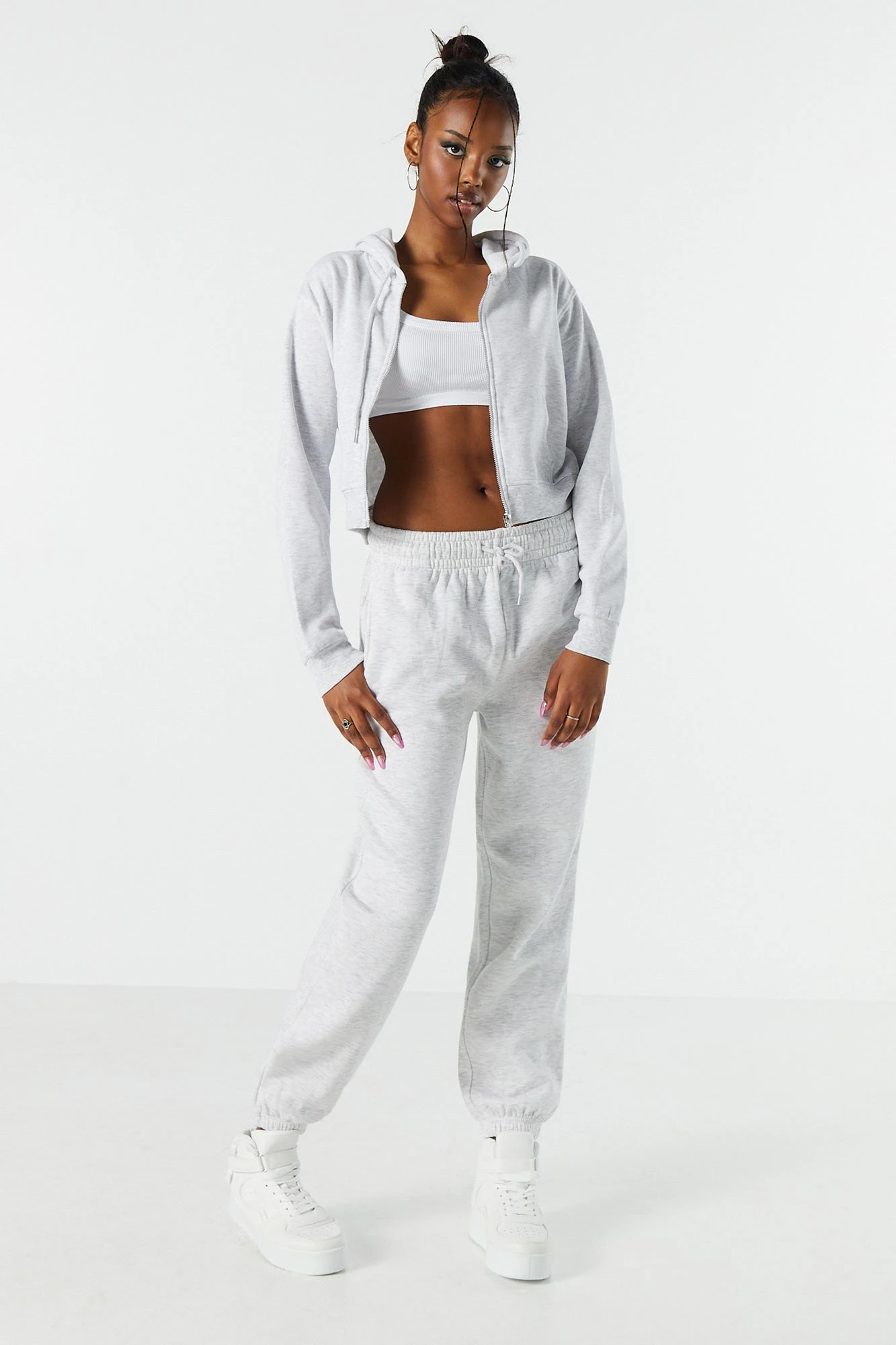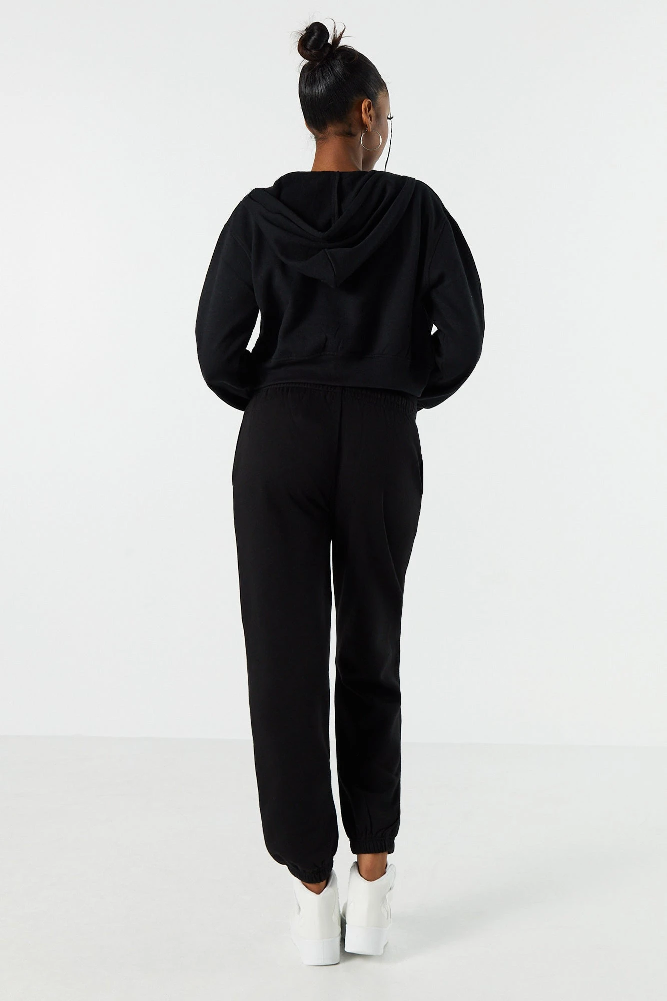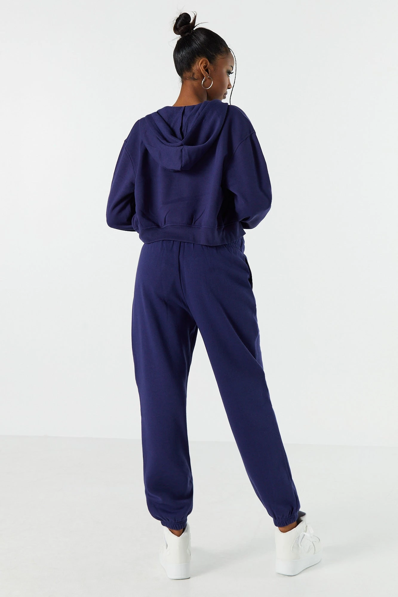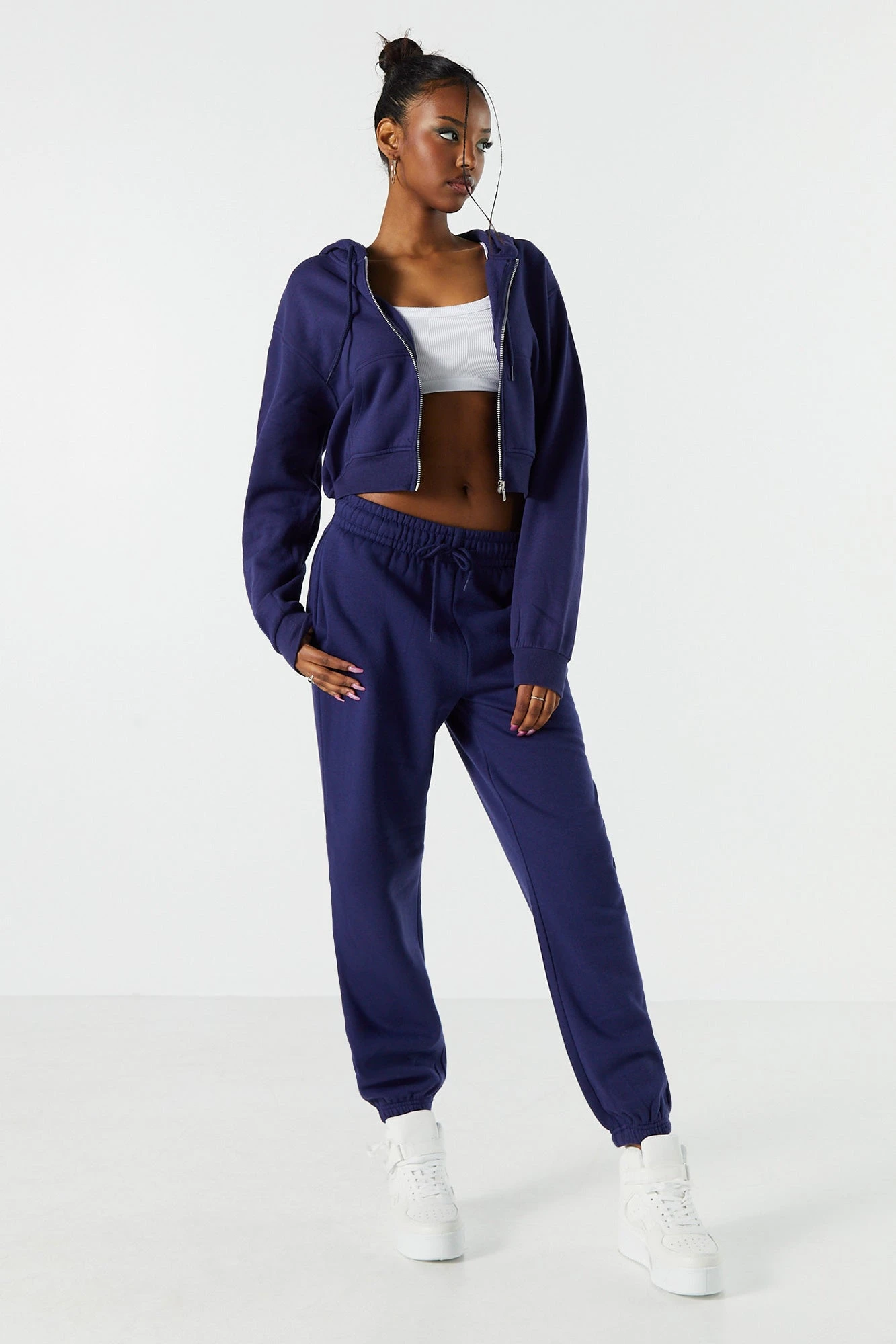 Update your off-duty wardrobe with this fleece jogger that is an everyday comfy and cute essential. This jogger features high-rise waist, fleece material, drawstring waist, slide-in pockets, and cinched ankles.
