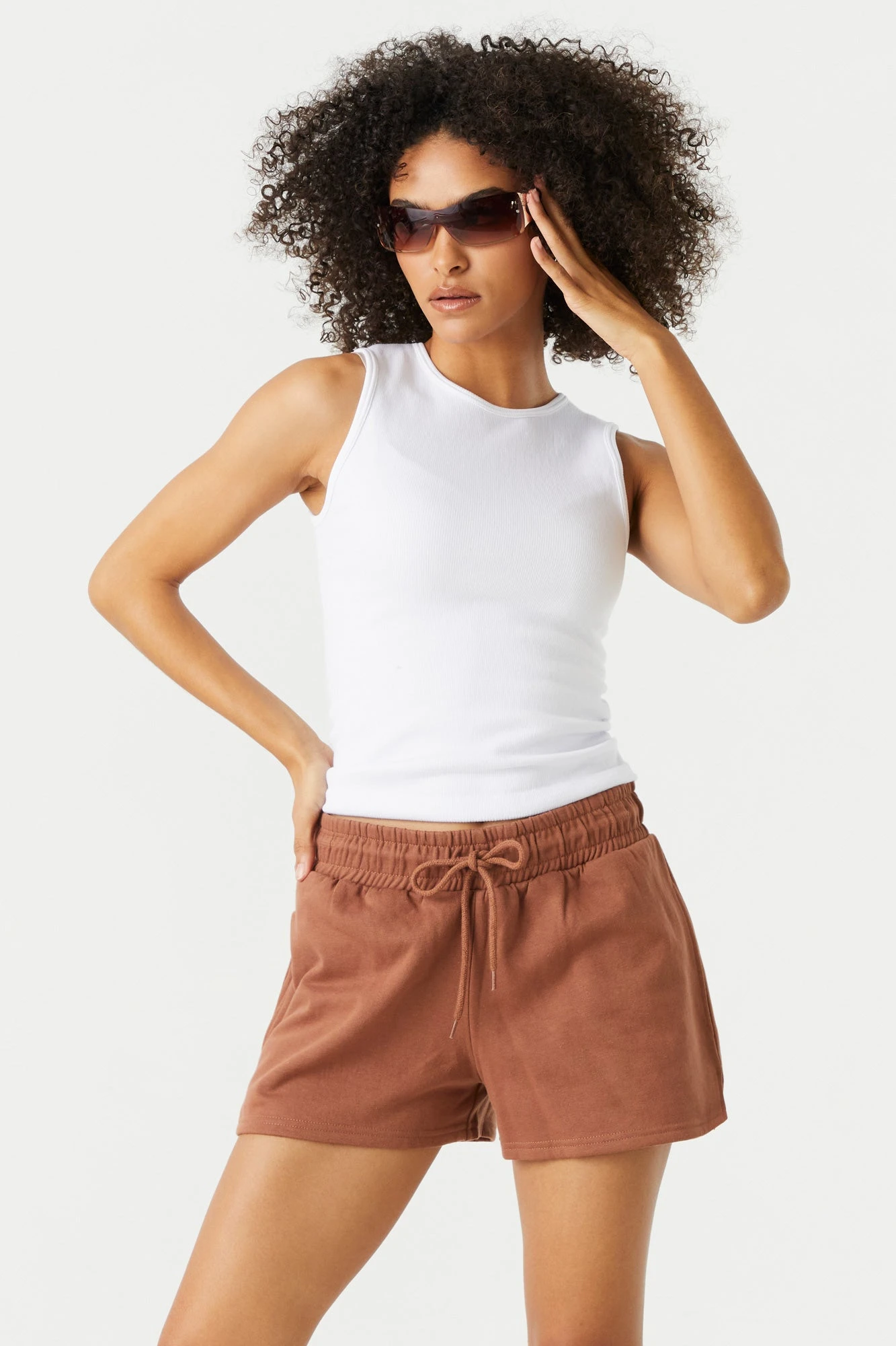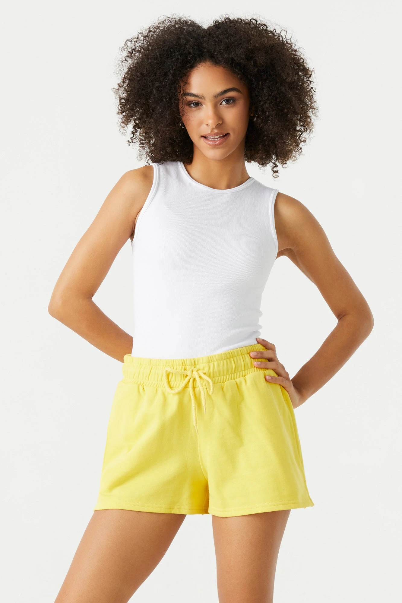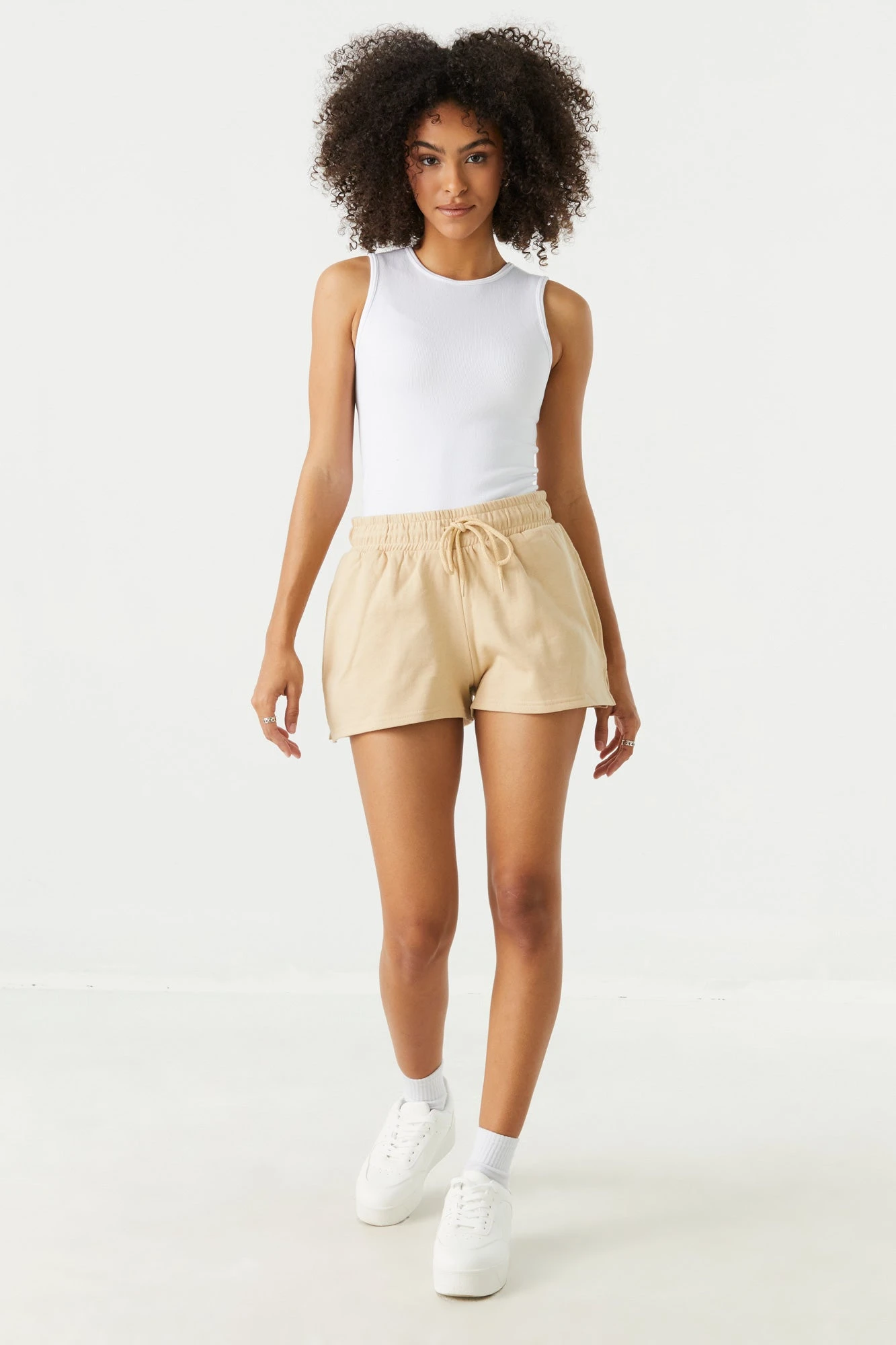 This short features high-rise wait, drawstring tie, tow pockets and fleece material. Size runs small.
