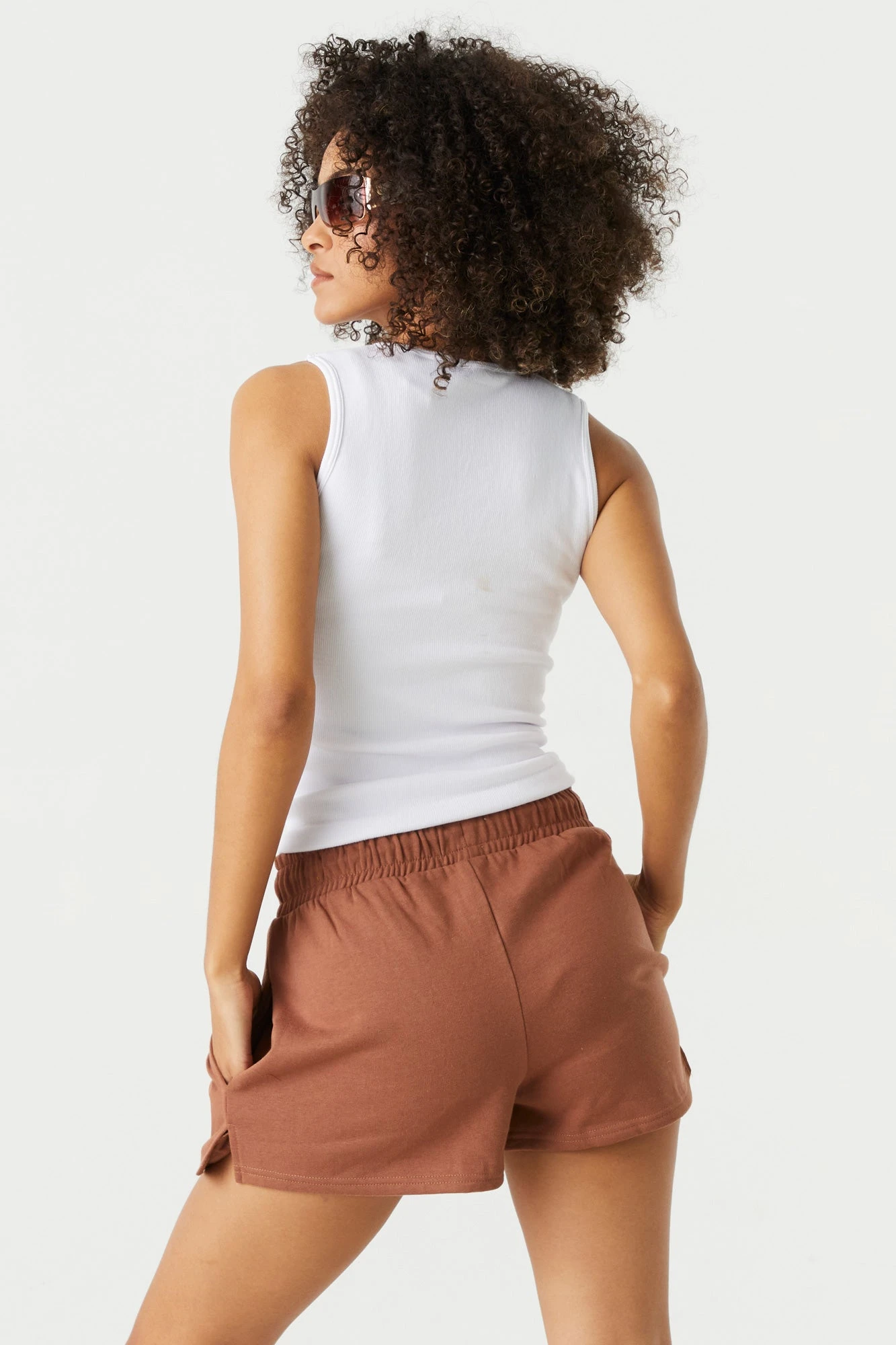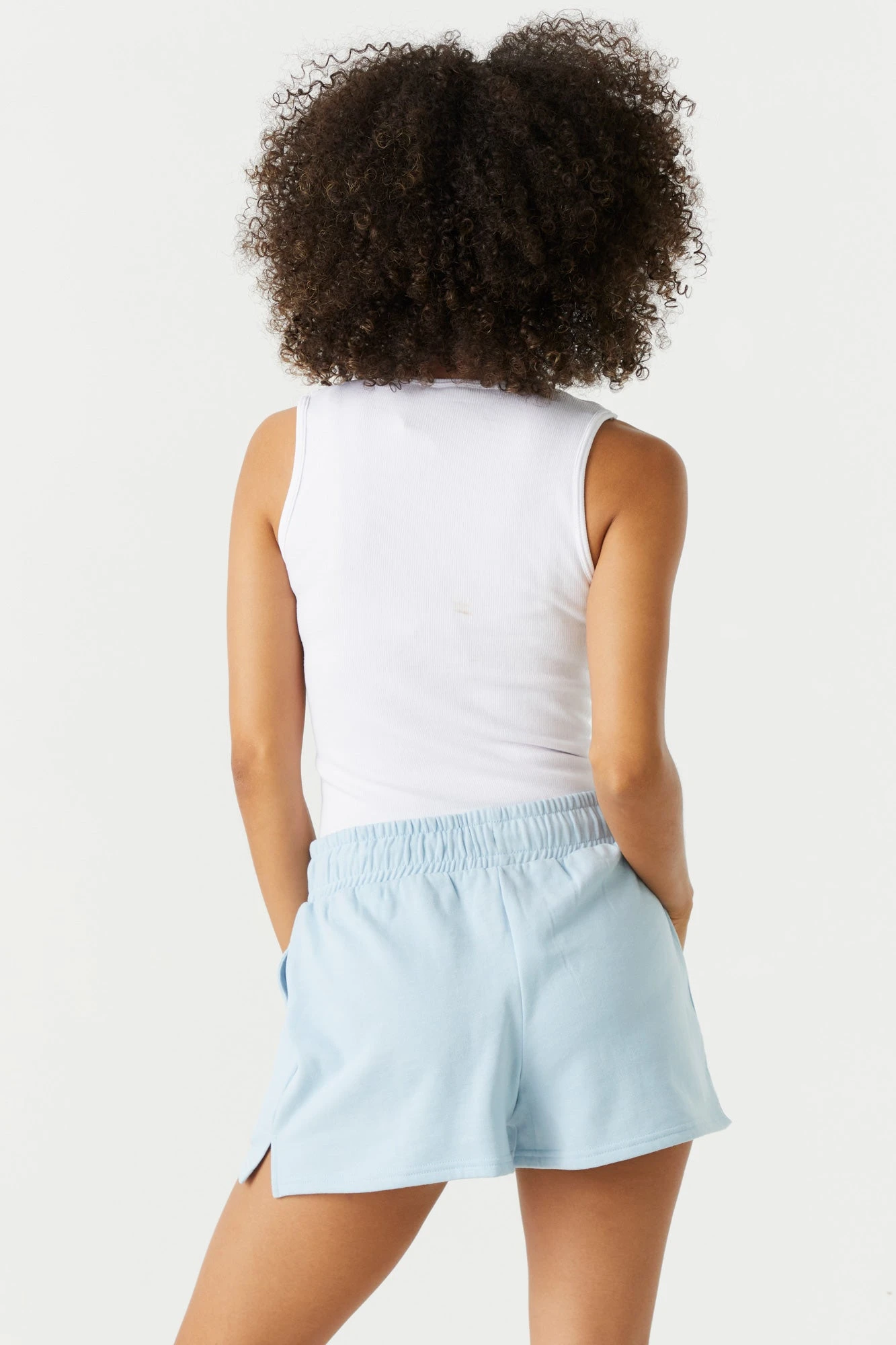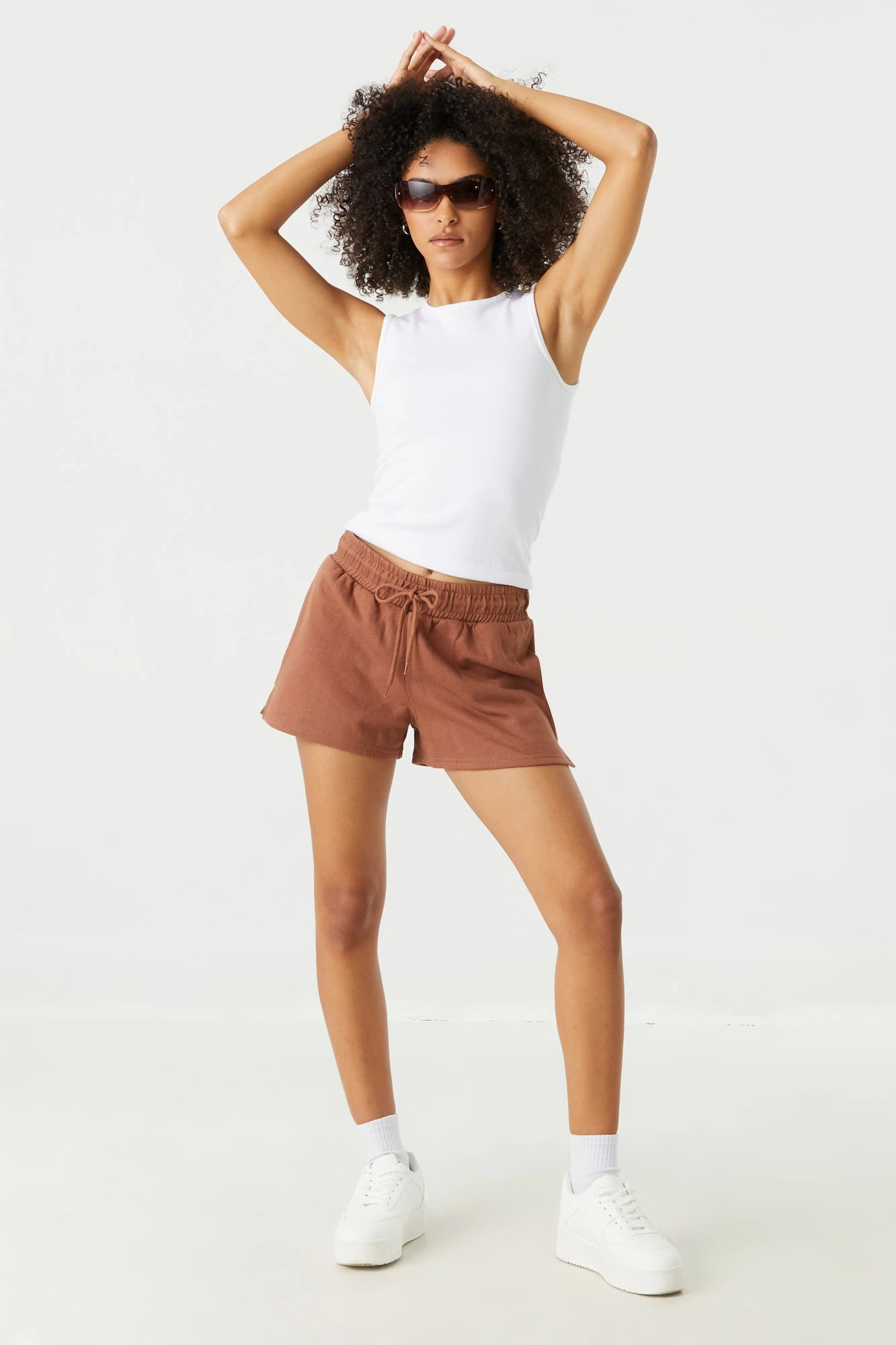 This short features high-rise wait, drawstring tie, tow pockets and fleece material. Size runs small.