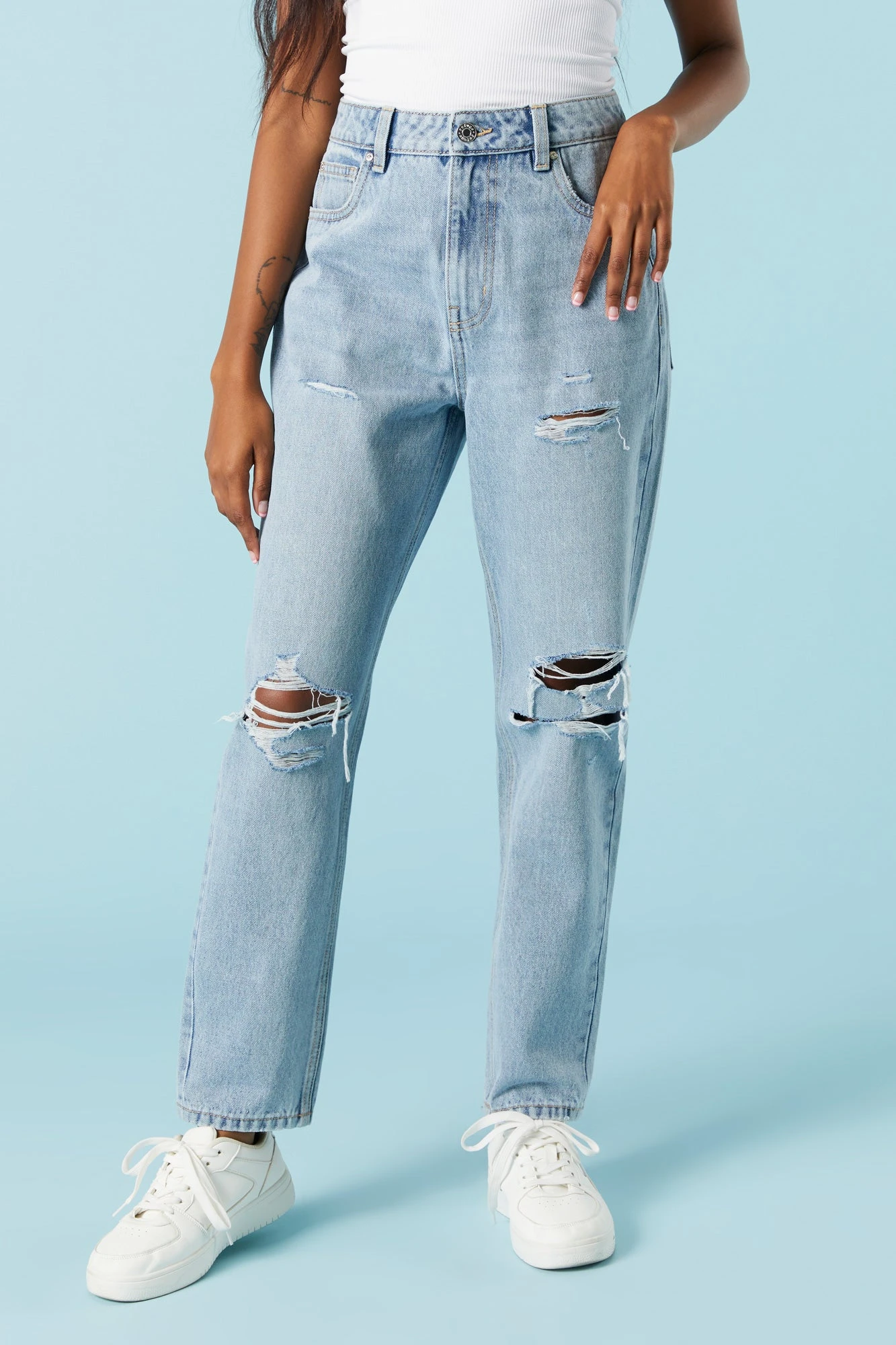 Distressed and best dressed! This jean features light wash, distressed denim material, mom fit, 5 pockets, zip-fly button-up closure, belt loops, and straight leg.